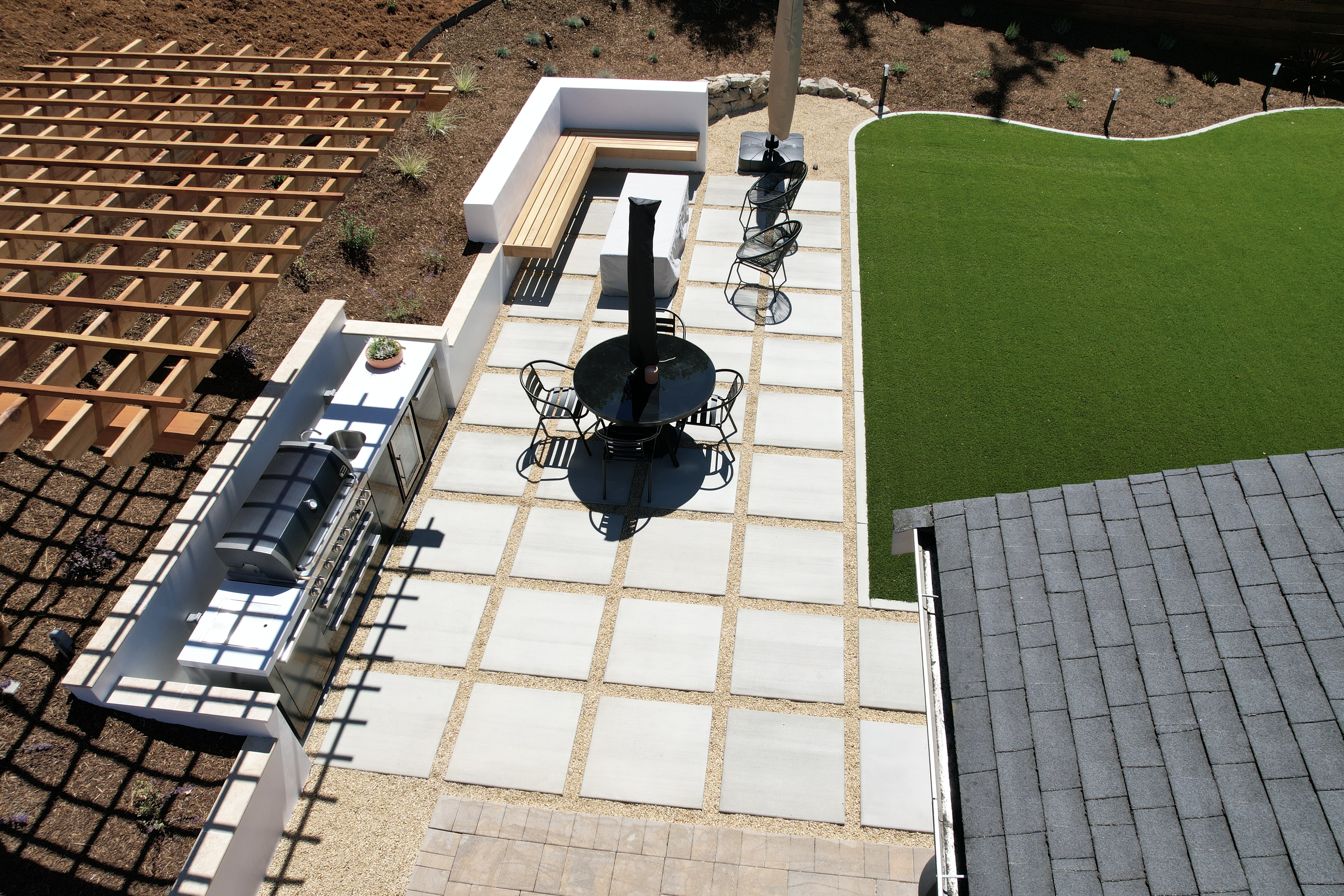 A $200K+ full estate transformation — ALVO's most comprehensive project. Features a BBQ island with natural gas, electrical, and water hookups, a 6-ft fire pit with floating bench, 120-ft concrete driveway, cantilever wooden pergola, outdoor TV, natural gas heaters, custom metal railings, 7-ft horizontal fencing, and complete hillside landscaping with drip irrigation throughout.