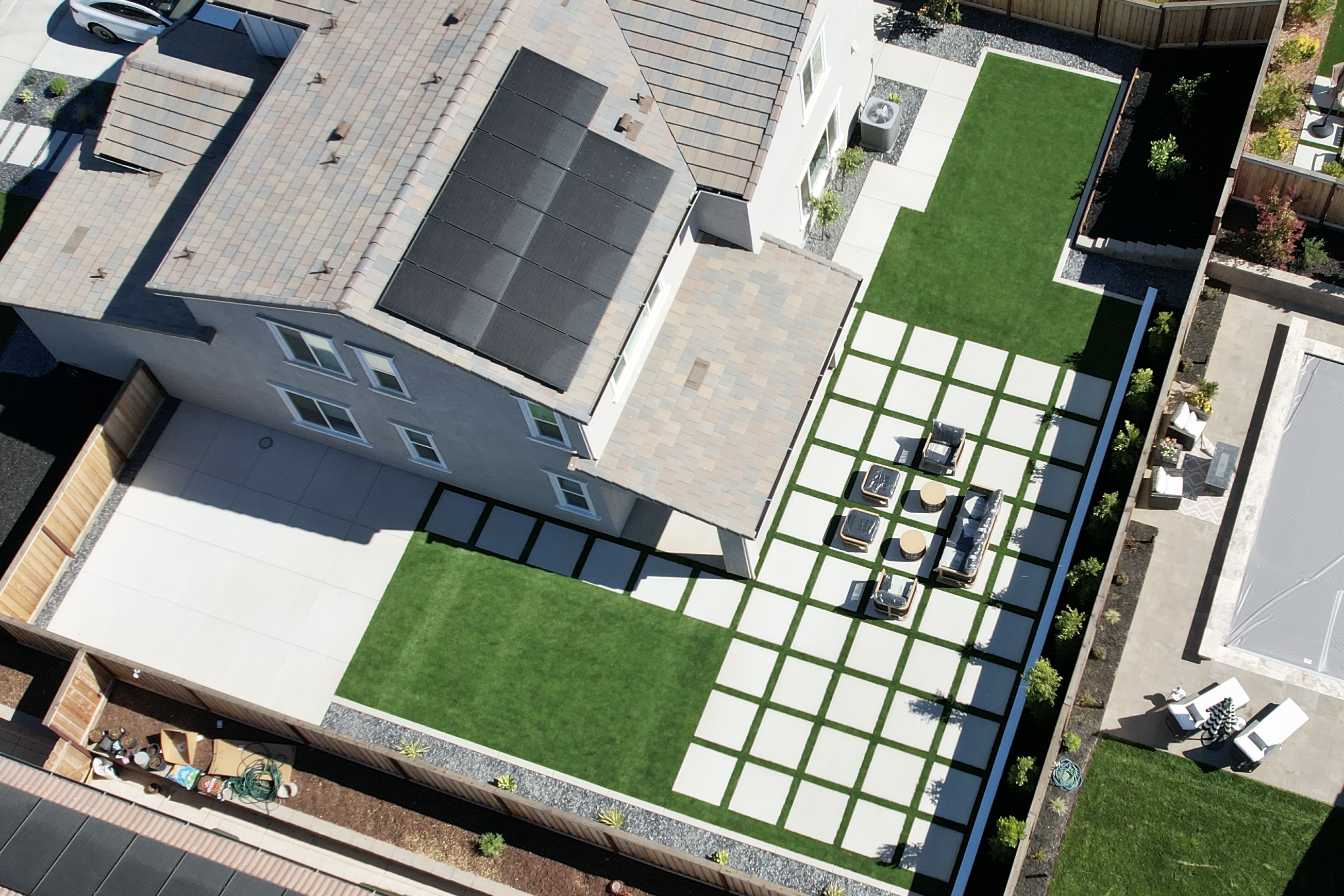 A comprehensive backyard transformation featuring broom finish concrete patios, walkways with square stepping stones and turf strips, a custom stucco seating wall painted white, full low-voltage lighting, and a complete new drainage system. Every inch of this yard was designed for outdoor living.