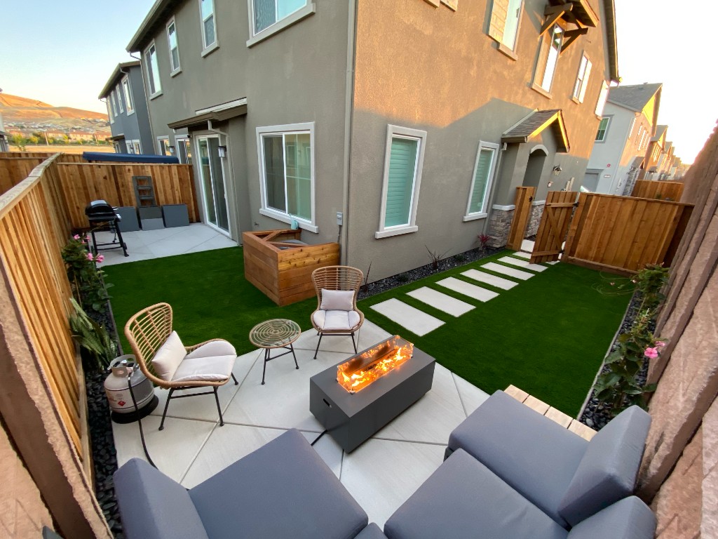 Full backyard transformation from bare dirt to a modern outdoor living space. We designed and built a custom concrete patio with diamond-cut pattern, installed lush artificial turf with stepping stone pathway, polished black rock borders, and a propane fire pit — creating the perfect spot for entertaining year-round.