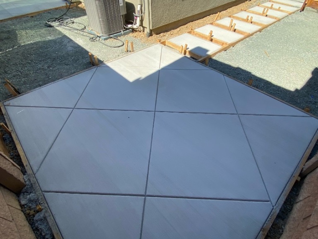 - Standard grey concrete patio with diamond-cut pattern